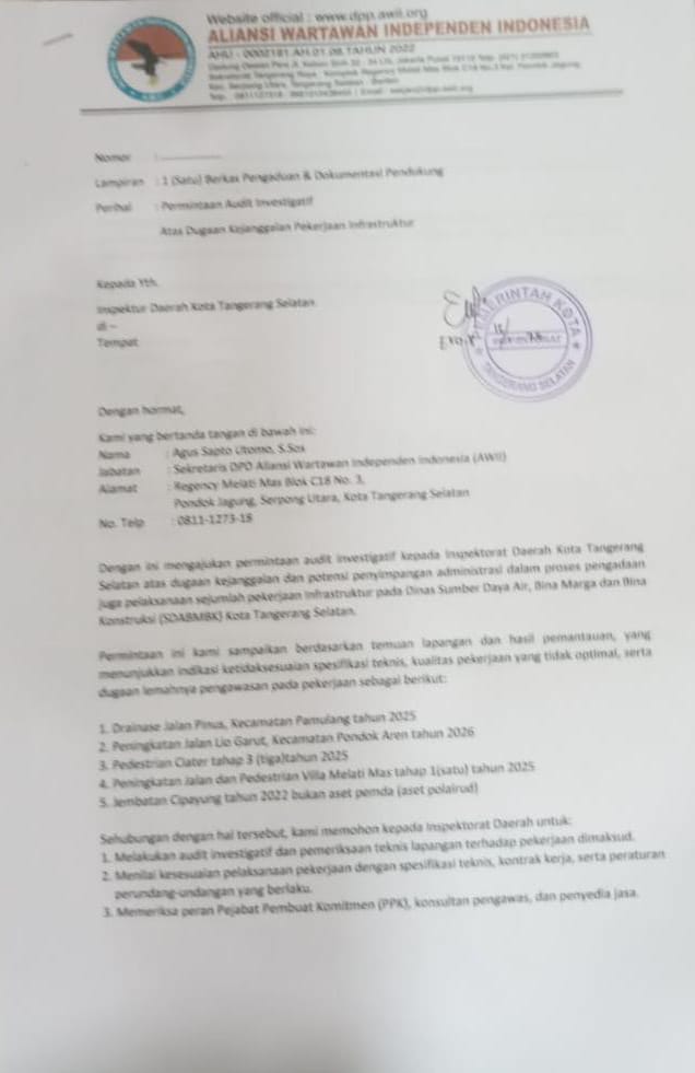 TANGERANG SELATAN – Dewan Pimpinan Daerah (DPD) Aliansi Wartawan Independen Indonesia (AWII) secara resmi mengajukan permintaan audit investigatif kepada Inspektorat Daerah Kota Tangerang Selatan melalui surat terkait dugaan kejanggalan dan potensi penyimpangan dalam sejumlah pekerjaan infrastruktur yang berada di bawah kewenangan Dinas Sumber Daya Air, Bina Marga dan Bina Konstruksi (SDABMBK).