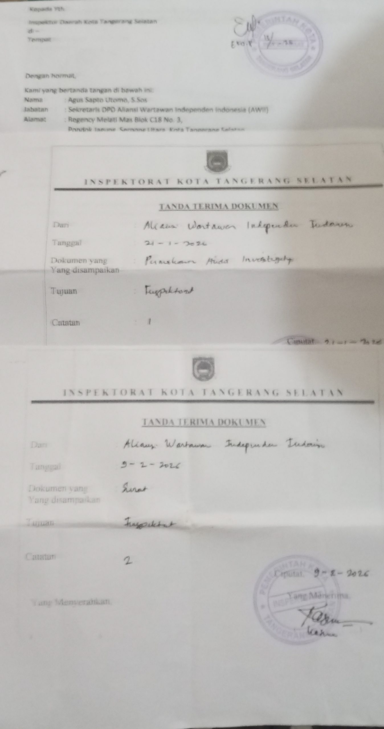 TANGERANG SELATAN – Kinerja pengawasan internal Pemerintah Kota Tangerang Selatan kembali menuai sorotan tajam. Surat resmi yang dilayangkan oleh Aliansi Wartawan Independen Indonesia (AWII) DPC Tangerang Raya kepada Inspektorat Kota Tangerang Selatan sejak Januari 2026 hingga kini belum pernah mendapatkan tanggapan ataupun klarifikasi resmi.