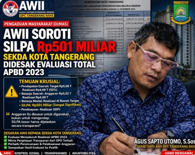 Pengaduan tersebut disampaikan oleh Sekretaris AWII DPC Tangerang Raya, Agus Sapto Utomo, S.Sos, sebagai bentuk kontrol sosial terhadap pengelolaan keuangan daerah.