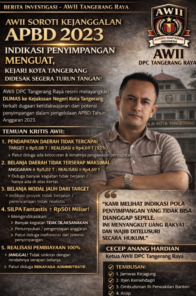TANGERANG – Aliansi Wartawan Indonesia (AWII) DPC Tangerang Raya melayangkan pengaduan masyarakat (DUMAS) kepada Kejaksaan Negeri Kota Tangerang terkait dugaan ketidakwajaran dalam realisasi Anggaran Pendapatan dan Belanja Daerah (APBD) Tahun Anggaran 2023.